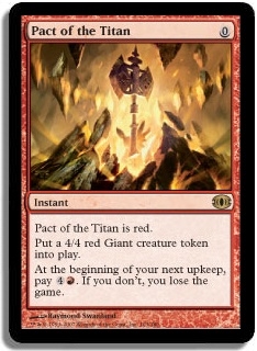 Pact of the Titan is red. Put a 4/4 red Giant creature token into play. At the beginning of your next upkeep, pay 4R. If you don't, you lose the game.