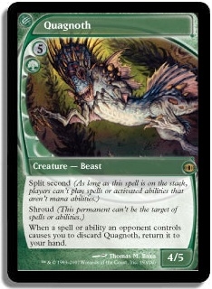 Split second (As long as this spell is on the stack, players can't play spells or activated abilities that aren't mana abilities.) Shroud (This permanent can't be the target of spells or abilities.) When a spell or ability an opponent controls causes you to discard Quagnoth, return it to your hand.