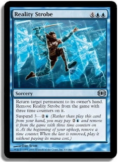 Return target permanent to its owner's hand. Remove Reality Strobe from the game with three time counters on it. Suspend 3-2U (Rather than play this card from your hand, you may pay 2U and remove it from the game with three time counters on it. At the beginning of your upkeep, remove a time counter. When the last is removed, play it without paying its mana cost.)