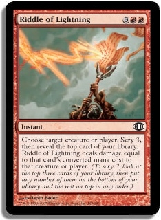 Choose target creature or player. Scry 3, then reveal the top card of your library. Riddle of Lightning deals damage equal to that card's converted mana cost to that creature or player. (To scry 3, look at the top three cards of your library, then put any number of them on the bottom of your library and the rest on top in any order.)