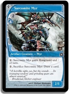 2: Sarcomite Myr gains flying until end of turn. 2, Sacrifice Sarcomite Myr: Draw a card.