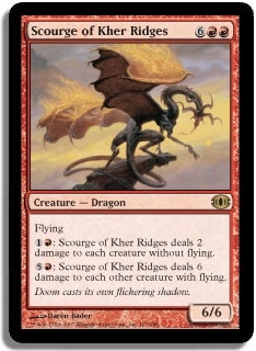 Flying 1R: Scourge of Kher Ridges deals 2 damage to each creature without flying. 5R: Scourge of Kher Ridges deals 6 damage to each other creature with flying.