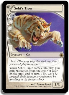 Flash (You may play this spell any time you could play an instant.) When Seht's Tiger comes into play, you gain protection from the color of your choice until end of turn. (You can't be targeted, dealt damage, or enchanted by anything of the chosen color.)