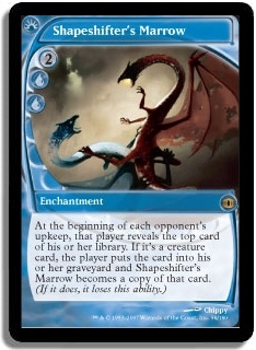 At the beginning of each opponent's upkeep, that player reveals the top card of his or her library. If it's a creature card, the player puts the card into his or her graveyard and Shapeshifter's Marrow becomes a copy of that card. (If it does, it loses this ability.)
