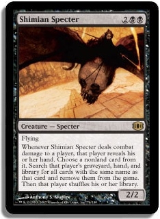 Flying Whenever Shimian Specter deals combat damage to a player, that player reveals his or her hand. Choose a nonland card from it. Search that player's graveyard, hand, and library for all cards with the same name as that card and remove them from the game. Then that player shuffles his or her library.