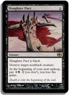 Slaughter Pact is black. Destroy target nonblack creature. At the beginning of your next upkeep, pay 2B. If you don't, you lose the game.