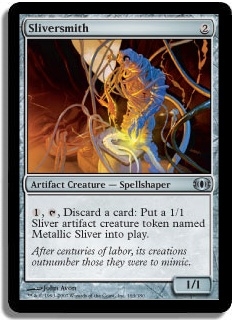 1, T, Discard a card: Put a 1/1 Sliver artifact creature token named Metallic Sliver into play.