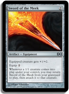 Equipped creature gets +1/+2. Equip 2 Whenever a 1/1 creature comes into play under your control, you may return Sword of the Meek from your graveyard to play, then attach it to that creature.