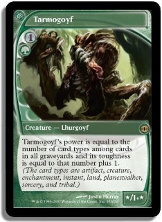 Tarmogoyf's power is equal to the number of card types among cards in all graveyards and its toughness is equal to that number plus 1. (The card types are artifact, creature, enchantment, instant, land, planeswalker, sorcery, and tribal.)