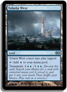 Tolaria West comes into play tapped. T Add U to your mana pool. Transmute 1UU (1UU, Discard this card: Search your library for a card with converted mana cost 0, reveal it, and put it into your hand. Then shuffle your library. Play only as a sorcery.)