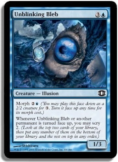 Morph 2U (You may play this face down as a 2/2 creature for 3. Turn it face up any time for its morph cost.) Whenever Unblinking Bleb or another permanent is turned face up, you may scry 2. (Look at the top two cards of your library, then put any number of them on the bottom of your library and the rest on top in any order.)