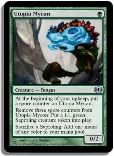 At the beginning of your upkeep, put a spore counter on Utopia Mycon. Remove three spore counters from Utopia Mycon: Put a 1/1 green Saproling creature token into play. Sacrifice a Saproling: Add one mana of any color to your mana pool.