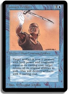 Target artifact is now a creature with both power and toughness equal to its casting cost; target retains all its original abilities as well. This will destroy artifacts with 0 casting cost.