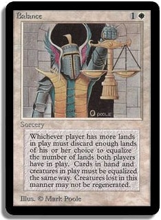 Whichever player has more lands in play must discard enough lands of his or her choice to equalize the number of lands both players have in play. Cards in hand and creatures in play must be equalized the same way. Creatures lost in this manner may not be regenerated.