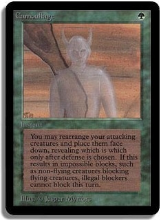 You may rearrange your attacking creatures and place them face down, revealing which is which only after defense is chosen. If this results in impossible blocks, such as non-flying creatures blocking flying creatures, illegal blockers cannot block this turn.
