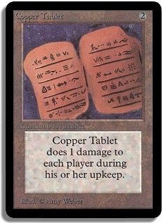 Copper Tablet does 1 damage to each player during his or her upkeep.