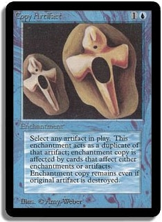 Select any artifact in play. This enchantment acts as a duplicate of that artifact; it is affected by cards that affect either enchantments or artifacts. The copy remains even if the original artifact is destroyed. Enchantments on the original artifact are not copied.
