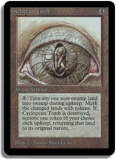 <2>: Turn any one non-swamp land into swamp during upkeep. Mark the changed lands with tokens. If Cyclopean Tomb is destroyed, remove one token of your choice each upkeep, returning that land to its original nature.