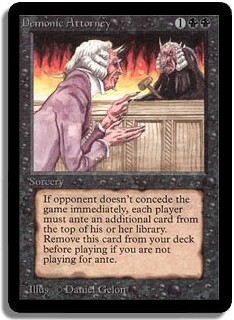 If opponent doesn't concede the game immediately, each player must ante an additional card from the top of his or her library. Remove this card from your deck before playing if you are not playing for ante.