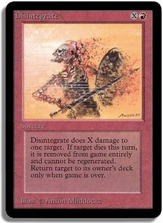 Disintegrate does X damage to one target. If target dies this turn, it is removed from game entirely and cannot be regenerated. Return target to its owner's deck only when game is over.