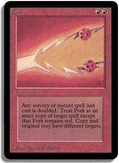 Any one sorcery or instant spell just cast is duplicated. Treat Fork as an exact copy of target spell except that Fork remains red. Caster of Fork chooses the copy's target.