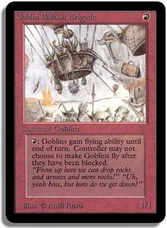 <R>: Goblins gain flying ability until end of turn. Controller may not choose to make Goblins fly after they have been blocked.