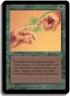 You may untap target creature both during your untap phase and one additional time during your turn. Target creature may attack the turn it comes into play.