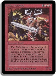 The Xs below are the number of non-wall creatures on your side, including Warlord. Thus if you have 2 other non-wall creatures, Warlord is 3/3. If one of those creatures is killed during the turn, Warlord immediately becomes 2/2.