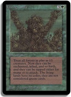 Treat all forests in play as 1/1 creatures. Now they can be enchanted, killed, and so forth, and they can be tapped either for mana or to attack. The living lands have no color; they are not considered green cards.