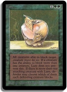 All creatures able to block target creature must do so. If a creature has the ability to block more than one creature, Lure does not prevent this. If there is more than one attacking creature with Lure, defender may choose which of them each defending creature blocks.