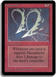 Whenever any land is tapped, Manabarbs does 1 damage to the land's controller.