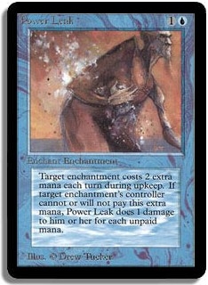 Target enchantment costs 2 extra mana during upkeep. If target enchantment's controller cannot or will not pay this extra mana, Power Leak does 1 damage to him or her for each unpaid mana.