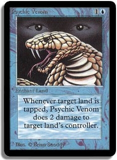 Whenever target land becomes tapped, Psychic Venom deals 2 damage to that land's controller.