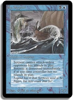 Serpent cannot attack unless opponent has islands in play. Serpent is destroyed immediately if at any time controller has no islands in play.