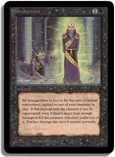 All damage done to you so far this turn is instead retroactively applied to one of your creatures in play. If this damage kills the creature it can be regenerated; even if there's more than enough damage to kill the creature, you don't suffer any of it. Further damage this turn is treated normally.