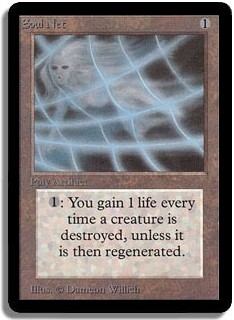 <1>: You gain 1 life every time a creature is destroyed, unless it is then regenerated.