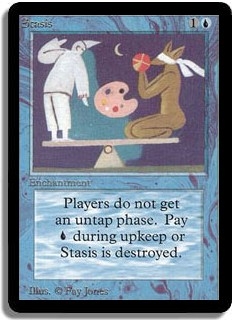 Players do not get an untap phase. Pay <U> during your upkeep or Stasis is destroyed.