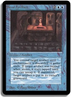 You control target artifact until enchantment is discarded or game ends. If target artifact was tapped when stolen, it stays tapped until you can untap it. If destroyed, target artifact is put in its owner's graveyard.