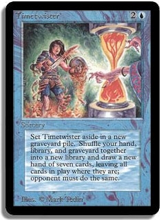 Set Timetwister aside in a new graveyard pile. Shuffle your hand, library, and graveyard together into a new library and draw a new hand of seven cards, leaving all cards in play where they are; opponent must do the same.