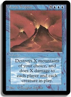 Destroys X mountains of your choice, and does X damage to each player and each creature in play.