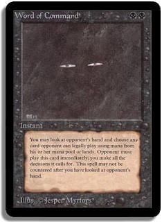 You may look at opponent's hand and choose any card opponent can legally play using mana from his or her mana pool or lands. Opponent must play this card immediately; you make all the decisions it calls for. This spell may not be countered after you have looked at opponent's hand.
