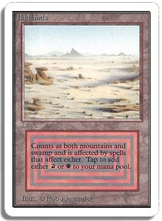 Tap to add either <R> or <B> to your mana pool. Counts as both mountains and swamp and is affected by spells that affect either. If a spell destroys one of these land types, this card is destroyed; if a spell alters one of these land types, the other land type is unaffected.
