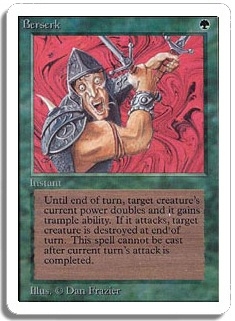 Until end of turn, target creature's current power doubles and it gains trample ability. If it attacks, target creature is destroyed at end of turn. This spell cannot be cast after current turn's attack is completed.