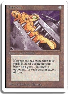 If opponent has more than four cards in hand during upkeep, Black Vise does 1 damage to opponent for each card in excess of four.