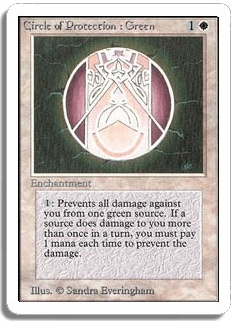 <1>: Prevents all damage against you from one green source. If a source does damage to you more than once in a turn, you must pay 1 mana each time you want to prevent the damage.