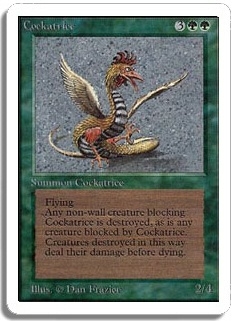 Flying. Any non-wall creature blocking Cockatrice is destroyed, as is any creature blocked by Cockatrice. Creatures destroyed in this way deal their damage before dying.