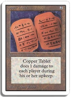 Copper Tablet does 1 damage to each player during his or her upkeep.