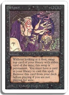 Without looking at it first, swap top card of your library with either card of ante; this swap is permanent. You must have a card in your library to cast this spell. Remove this card from your deck before playing if you are not playing for ante.