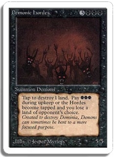 Tap to destroy 1 land. Pay <BBB> during upkeep or the Hordes become tapped and you lose a land of opponent's choice.