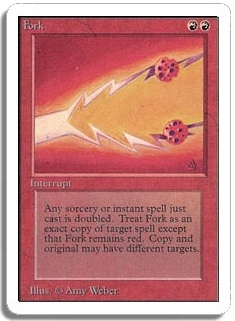 Any one sorcery or instant spell just cast is duplicated. Treat Fork as an exact copy of target spell except that Fork remains red. Caster of Fork chooses the copy's target.